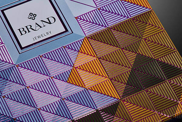 Hot stamping enables a wide range of visual and tactile effects: from high-gloss metallic looks to matte, satin, or brushed surfaces to holographic diffractive light effects. KURZ offers various product lines for this purpose, such as LUXOR® (gold), ALUFIN® (silver), COLORIT® (matte), and LIGHT LINE® (diffractive). With the help of special embossing dies, genuine relief structures and 3D effects can also be created—for designs that shine visibly and impress tangibly at the same time.